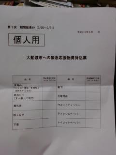 最寄りの体育館で,被災地の方々を受け入れている施設体育館があります・・・そこでは,被災地への支援物資も受け入れており,自身は,早速,支援物資をダンボールに詰めて,係員に手渡しました・・・。無論,名前も住所も,一切,書いてはおりません・・。ただ,一枚の用紙に,元気を出してもらうよう,一筆,書いて,箱の中に一緒に詰めました・・。それから,その体育館の駐車場には,福島原子力発電所の被爆から逃れてきた,福島・いわきナンバーの車が,多く停まっていました・・。